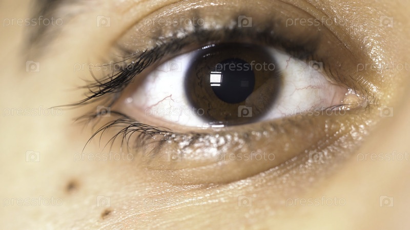 Закройте фотографию красивых карих глаз молодого человека, лицо концептуальной детали СМИ. зрачок мужского глаза сужается и расширяется