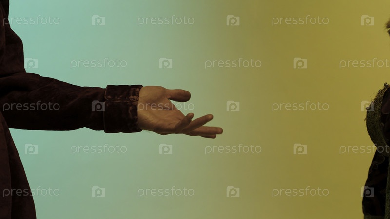 Восточный мужчина берет кусок золотой крупицы у другого человека, его руки изолированы на красочном фоне