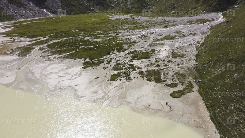 Вид с воздуха необычного белого озера возле зеленого поля у подножия гор в солнечный летний день