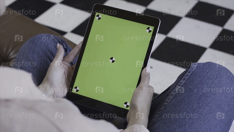Молодая брюнетка смотрит на свой планшет с зеленым экраном на черно-белом фоне пола