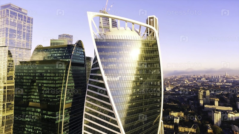 Воздух знаменитого города Москвы, современного городского района с международным деловым и финансовым центром на закате, Россия. Сцена. Полеты вокруг современных зданий со стеклянными фасадами, концепция архитектуры