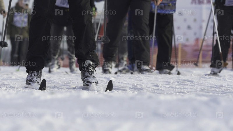 Массовый старт мужчины спортсмены лыжники во время чемпионата по лыжному спорту