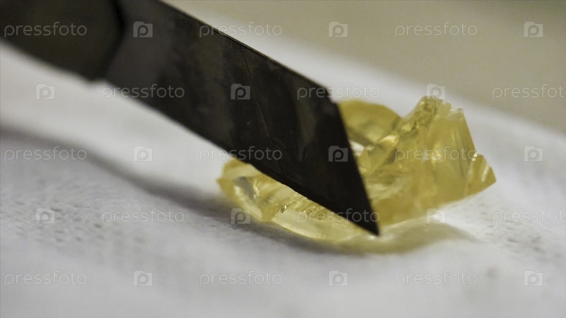 Очень близко к желтому прозрачному минеральному камню, коснувшемуся резчиком на фоне белой ткани.Золотой маленький кусок минерального камня лежит на столе в лаборатории