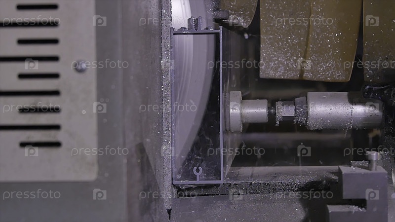 Круговая пила для резки алюминия. Металлическое сечение. Круглая пила, металлический профиль или металловый стержень. Профили резания для изготовления витража. Создание нового пластикового окна. Стекло