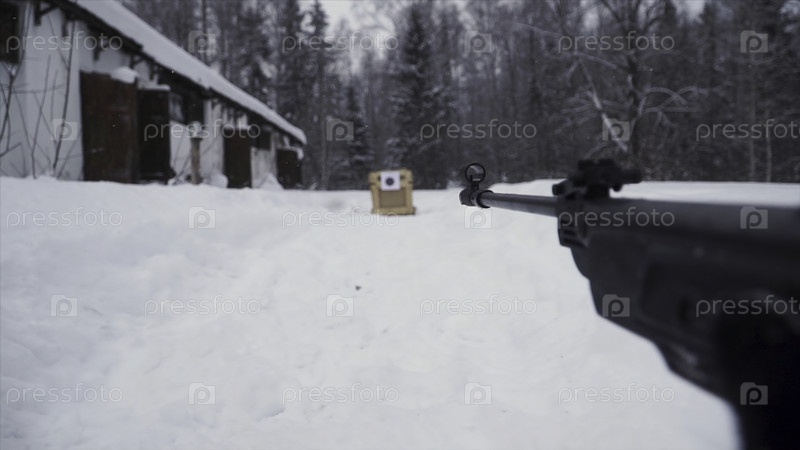 Стрелок в камуфляже наносит удар по цели из винтовки с оптическим прицелом, фокусируется на оружии