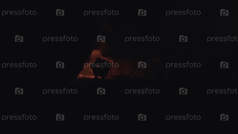 Сзади мужчина, сидящий на коленях и заглядывающий внутрь подземной пещеры. Резервные кадры. Следователь отправляет красный сигнал ожога вместо факела