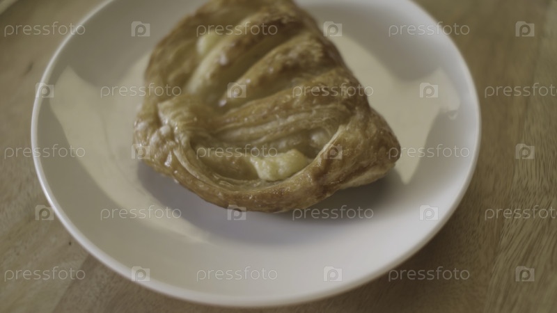 Закройте сладкую булочку, лежащую на белой стеклянной тарелке и вращающуюся. резервные кадры. вид сверху от крутящейся кондитерской продукции, концепция пищевого порно