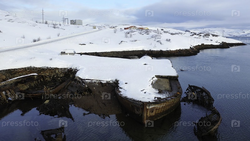 Вид с воздуха на кладбище старых ржавых кораблей у снежного побережья холодного моря в зимний сезон.Путешествие над разрушенными лодками и заснеженными холмами возле тихого моря