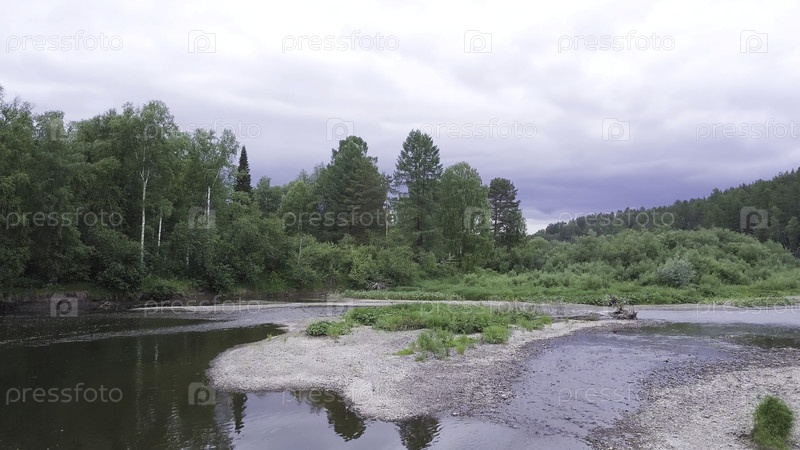 Вид с воздуха на естественный фон с узкой рекой, каменистым берегом и красивым зеленым лесом в облачном небе. резервные кадры. Концепция летней природы, экологии и туризма