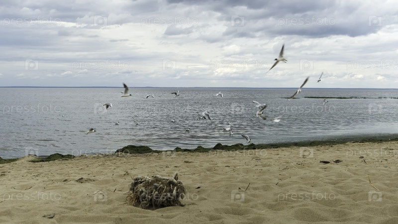 Серые чайки летают возле песчаного пляжа на побережье Балтийского моря.Морской пейзаж с морскими волнами, золотым песком и стаей чайков
