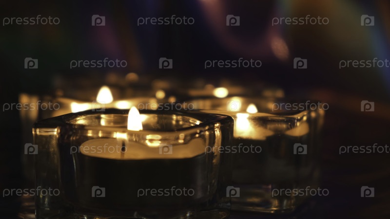 Закрыть маленькие свечи в стеклянных светильниках, стоящих на столе в темной комнате, создавая романтическую атмосферу свиданий