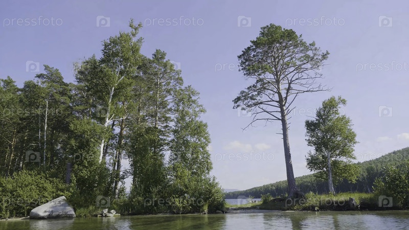 Красивые прозрачные голубые воды на берегу озера.Лесной пейзаж на побережье отражается в воде