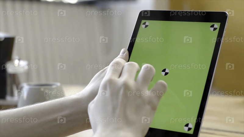Человек работает с планшетом, нажимая на зеленый экран. резервные записи. гладкие руки, держащие и нажимающие зелёный сенсорный экран планшета