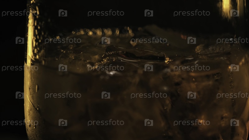 Завершается процесс налива алкогольного напитка в стакан со льдом, выделенным на темном фоне.Концепция вечеринки - налив виски, коньяка и скотча в бокал со многими кубиками льда