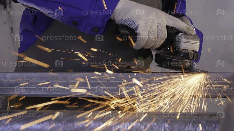 Ремесленник пил металл с помощью дисковой мельницы в мастерской. Металлическая шлифовка летящими искрами. Электрическое измельчение колес на стальной конструкции на заводе низкоскоростных жалюзи. Металлическая шлифовка оранжевыми летающими искрами