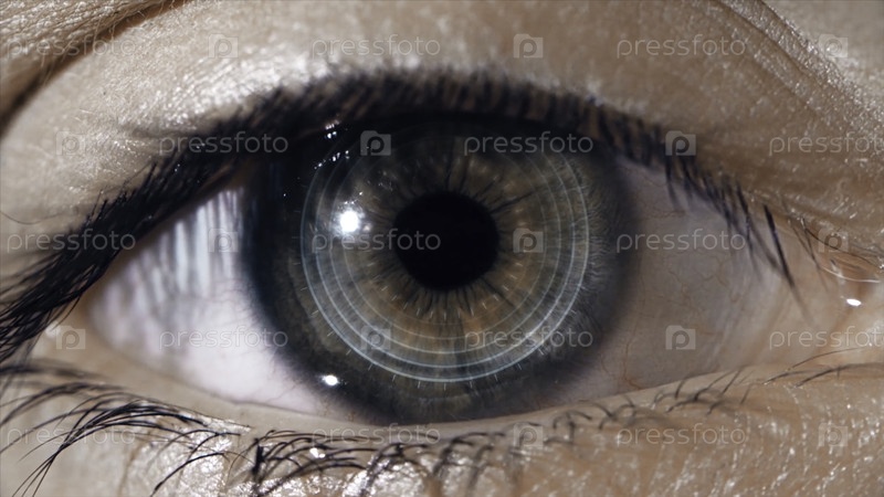 Технологическая линза на глазу. Концепция будущих технологий. Женское око с футуристической линзой, макро