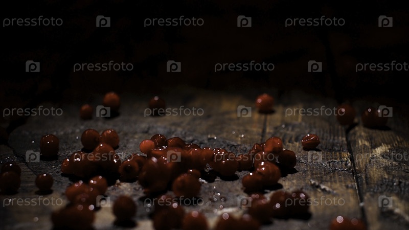 Покройте сочные красные ягоды, падающие на темно-коричневый старый деревянный стол на черном фоне, приготовление пищи и гастрономическую концепцию