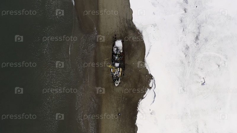 Вид парусника, который разбился на побережье Антарктиды. Кадр. Летающий над зимним снежным побережьем у моря и старого ржавого корабля