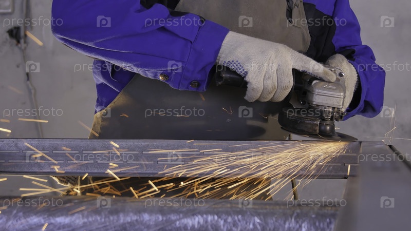 Ремесленник пил металл с помощью дисковой мельницы в мастерской. Металлическая шлифовка летящими искрами. Электрическое измельчение колес на стальной конструкции на заводе низкоскоростных жалюзи. Металлическая шлифовка оранжевыми летающими искрами