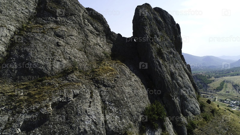 Воздух большого рельефа скал среди густого зеленого леса, растущего в долине. стрельба. закрывает горную вершину, покрытую зелёным мхом с зеленым полем позади