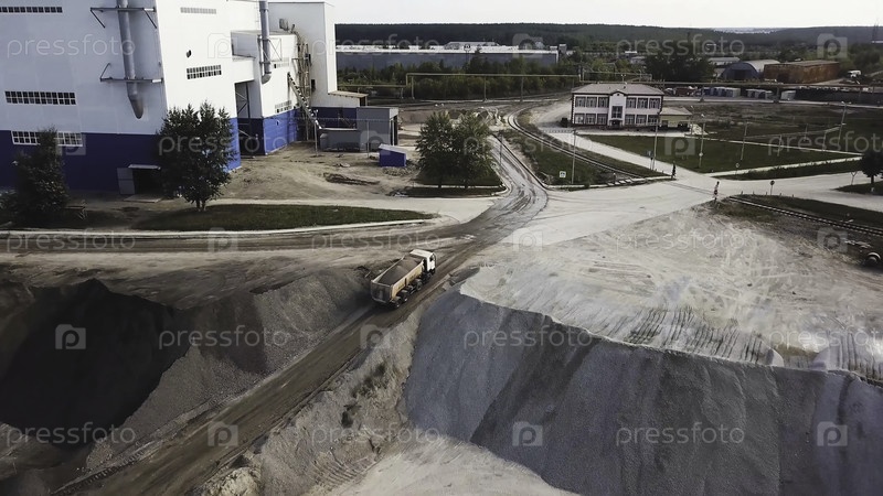 Вид с воздуха на карьер в рабочее время. Резервные кадры. Промышленный фон с песчаным карьером и загруженным грузовиком, идущим на завод, профессиональным оборудованием и машинами