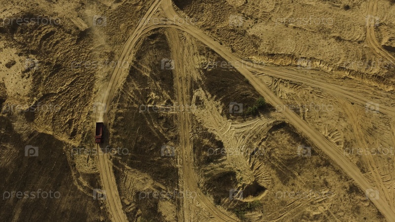 Воздух самосвалов, едущих по сельской пыльной дороге, концепция транспорта.Сцена.Вид грузовика, движущегося вдоль грязной дороги на селе в летний день