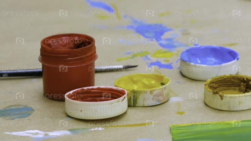 Откройте небольшую банку красной краски, стоящую на столе с цветными пятнами и кистью - художественная и детская концепция творчества