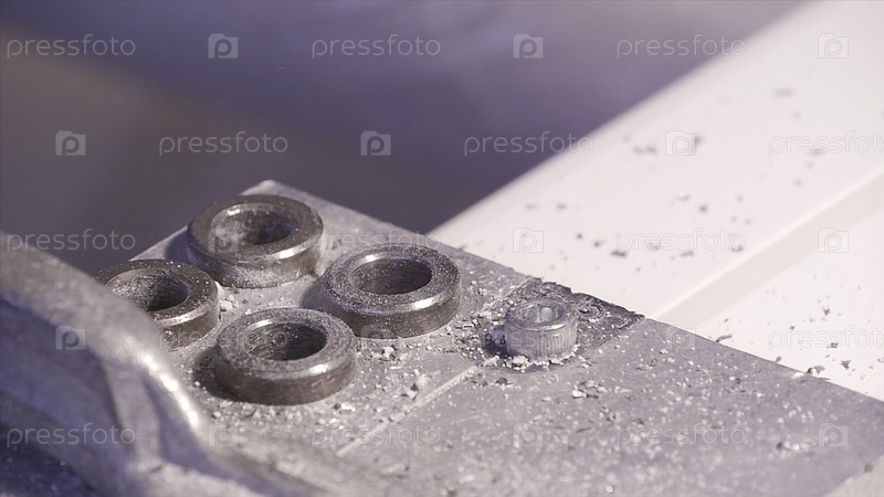 отверстие, пробуренное в алюминий и металл с помощью электрического бурового инструмента. ближайшее бурение из алюминия или металла на металлической мастерской с использованием электробуровки. рабочий бурит плоскую стальную пластину с помощью буровой скам