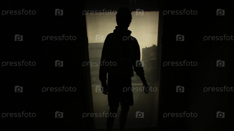 Силуэт мужчины смотрит в окно со светом в комнате. кадры. силуэт молодого одинокого человека в комнате. понятие одиночества