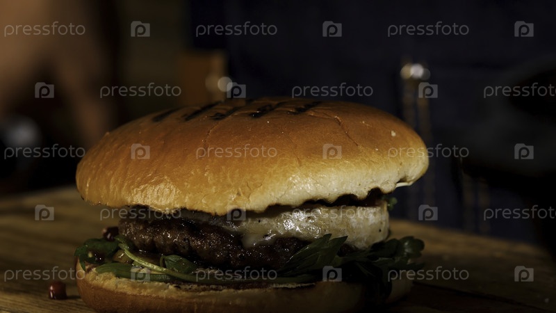 Закрытие дома от вкусного гамбургера на деревянном столе, гастрономии и концепции порнографии. резервные кадры. сочный бутерброд с говядиной, сыром, салатом и луком
