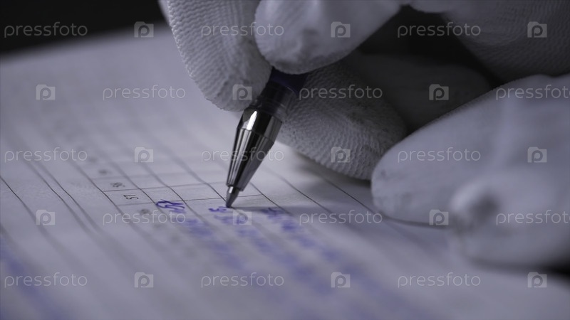 Закройте руки в белых перчатках, записывая данные в блокнот с ручкой на черном фоне