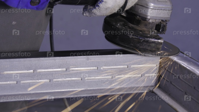 Ремесленник пил металл с помощью дисковой мельницы в мастерской. Металлическая шлифовка летящими искрами. Электрическое измельчение колес на стальной конструкции на заводе низкоскоростных жалюзи. Металлическая шлифовка оранжевыми летающими искрами