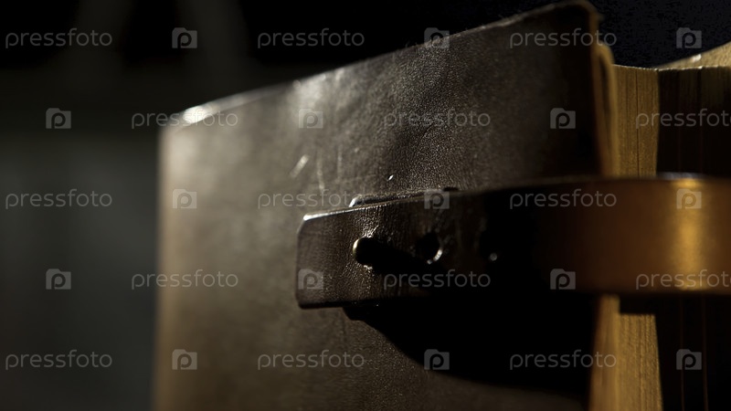 Древняя кожаная книга с ремнем. Резервные кадры. Закройте древний кожаный коричневый дневник или книгу со желтыми страницами, выделенными на черном фоне