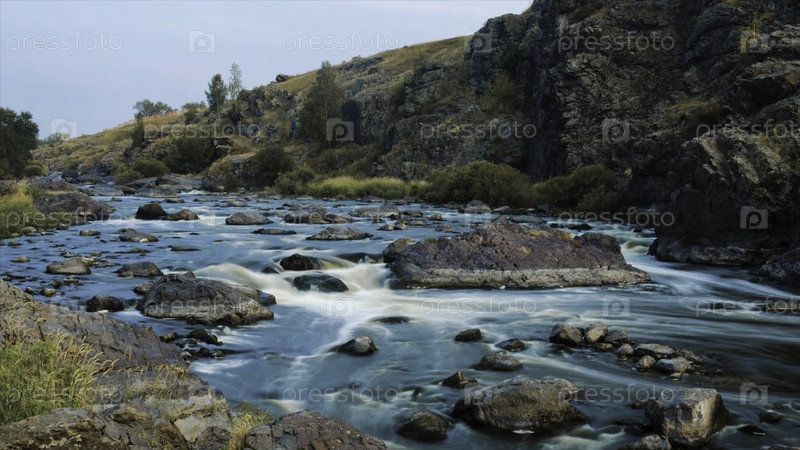 Красивая речная вода течет над скалами и камнями на рассвете. видео. поток реки через камни. временной интервал