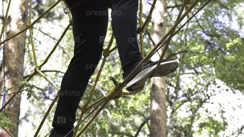 Близкий к человеку на высокой тропинке в лесистом приключенческом парке, концепция экстремального спорта на открытом воздухе.Человек в черных кроссовках ходит по джунглям по веревочной дороге