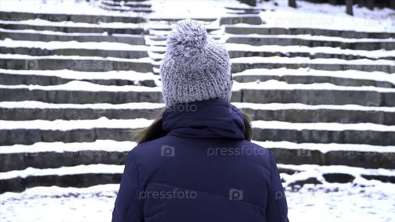 Сзади вид женщины с шляпой остается в парке во время снега, на фоне заснеженной лестницы одна женщина оставлена одна. снег зимой, пейзаж, романтическая сцена
