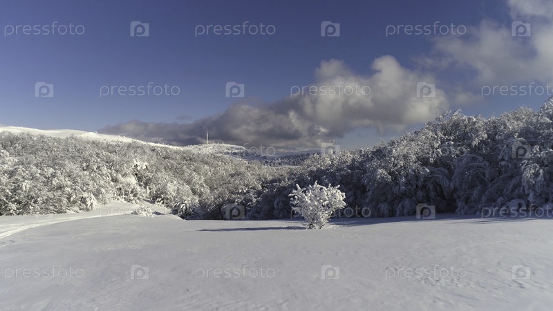 Фантастический зимний пейзаж высоких гор и снежного леса на фоне облачного синего неба.Солнечный день в белом, зимнее камни и деревья покрыты снегом против яркого неба