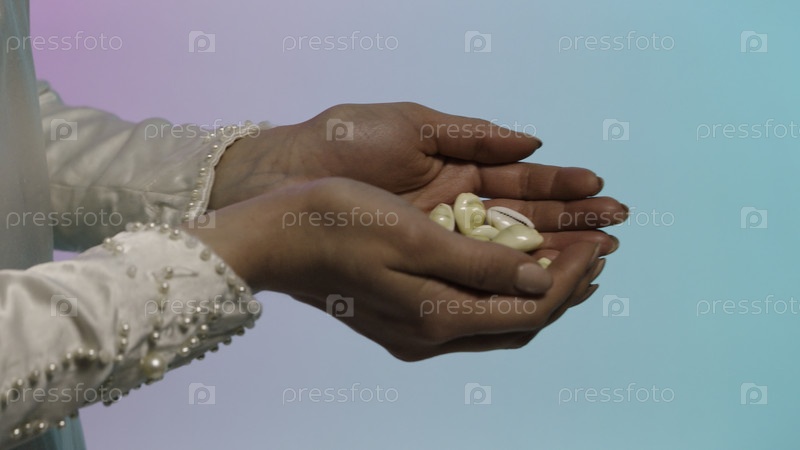 Закройте руки с восточной молодой женщиной, отдавая много маленьких ракушек мужским рукам.Сток.Восточная женщина в белом платье держит и передает человеку множество небольших креветок