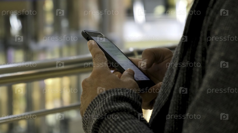 Закройте руки человека, отправив сообщение на фоне торгового центра.Мужчины используют свои смартфоны для общения в социальных сетях