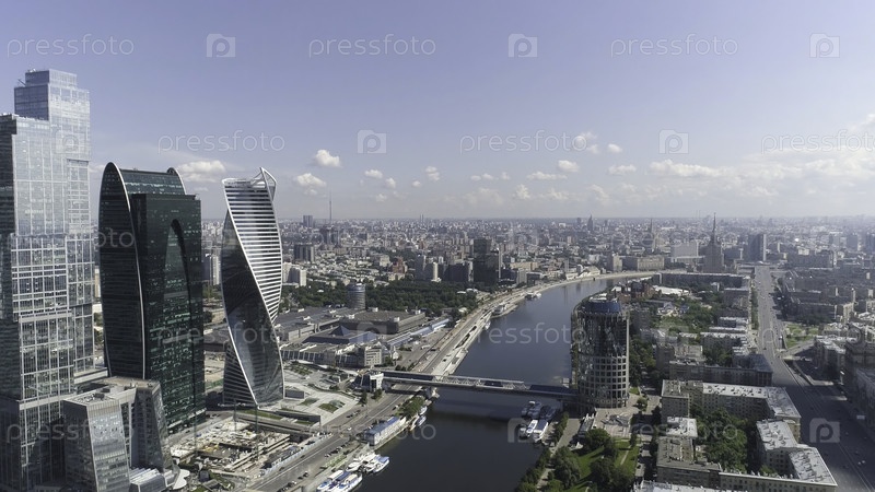 Потрясающий пейзаж небоскребов возле Московской реки и Баграционного моста днем, Россия.Воздух для высоких современных зданий со стеклянным фасадом
