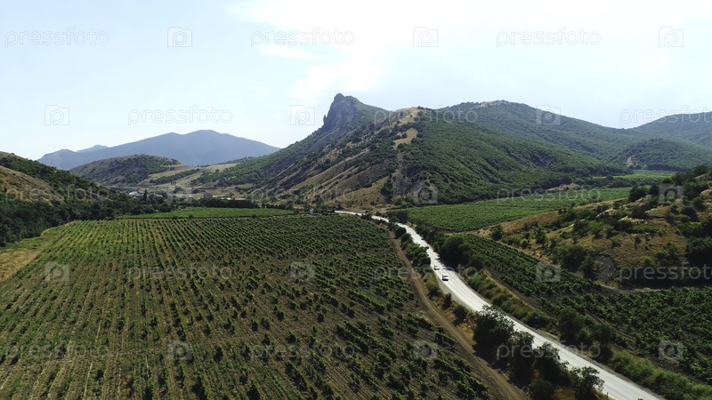 Прекрасный летний пейзаж.В воздухе вид дороги с движением транспорта между зелеными сельскохозяйственными полями и горами, покрытыми травой против синего неба в солнечный день