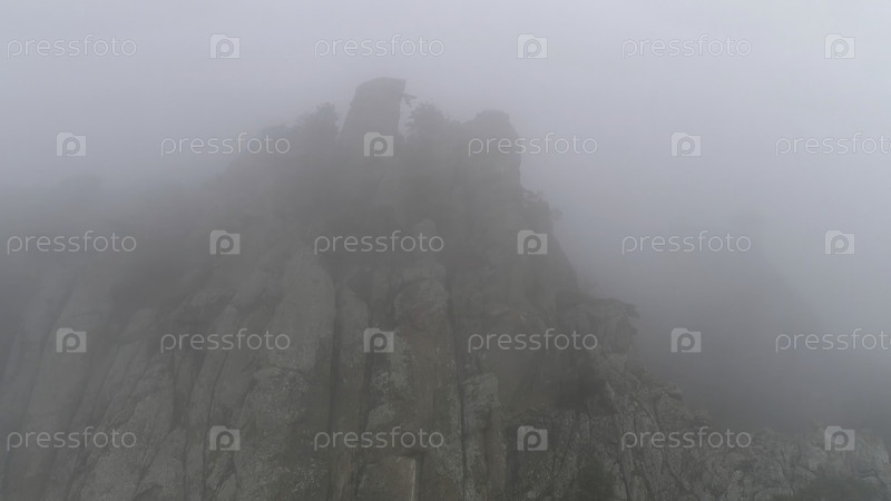 Вид сверху на скалы в густом тумане.Стрельба.Таинственные горы, покрытые утренним туманом, вид снизу