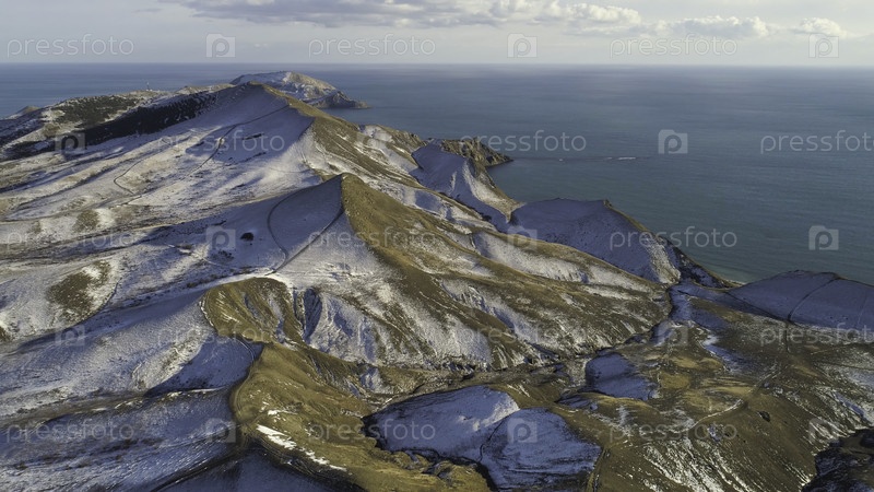 Вид с воздуха на заснеженные скалы, голубое море на фоне облачного неба.Снежные холмы Исландии у моря в зимний день