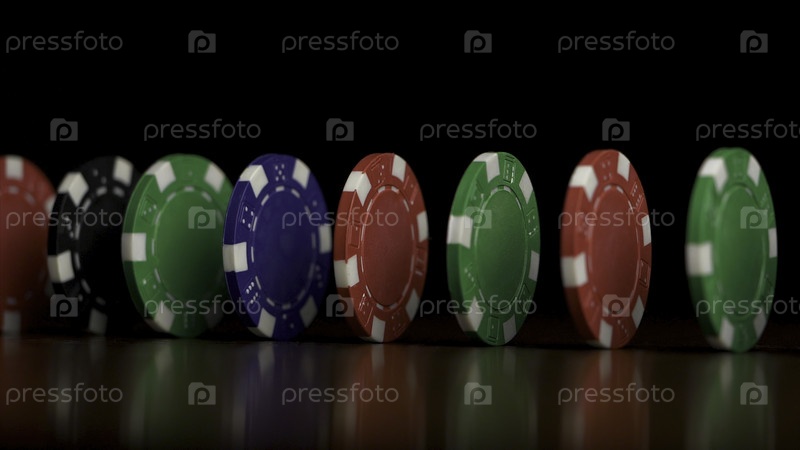 Играя в фишки покера на отражающем черном фоне.Фишки покер выстроены в соответствии с темным фондом.Цветные фишки покера стоят на белом свете и чёрном фоне