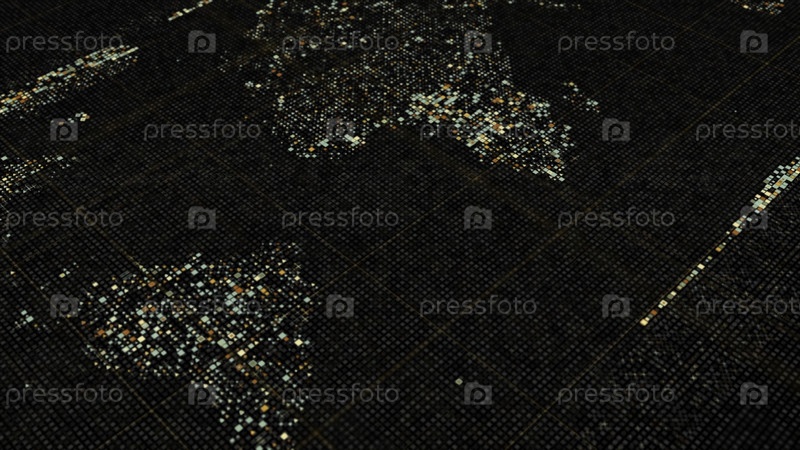 Абстрактная анимация карты мира на цифровом экране, сформированном крошечными фигурами. Анимация. Цифровой экран со континентами, медленно протекающими на черном фоне, плавный цикл