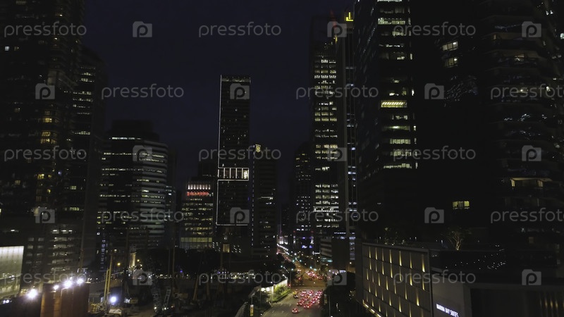 Вид на улицу с автомобилями и современными зданиями в крупном китайском городе ночью.Стрельба.Ночной вид из воздуха на центр города со своей дорогой, движущимися машинами, огнями небоскребов, концепцией ночной жизни
