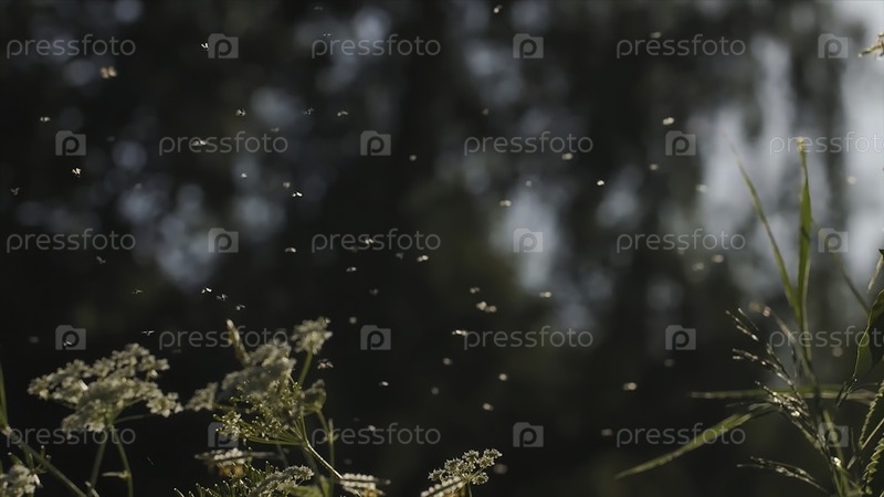 Закрытый Herakleum um sibiricum, окруженный многими мухами. Движение. Насекомые летают вокруг травы и цветов летнего поля, естественного сельского ландшафта