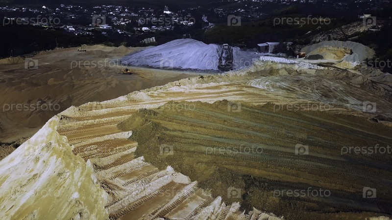 Вид с воздуха на карьер и движение горных грузовиков, тяжелую промышленность и концепцию машин. резервные кадры. Процесс транспортировки полезных ископаемых, добыча экскаваторов вблизи горных дорог