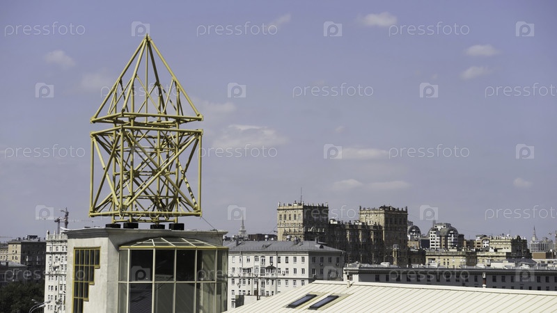 Золотая конструкция смотровой площадки Московского Президиума.Детали РАС в Москве на фоне голубого облачного неба