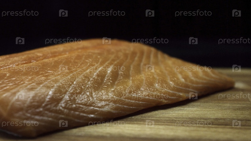 Закройте для свежего, вкусного стейка из лосося на деревянной режущей доске, изолированной на черном фоне. сырое красное рыбное филе на деревянной режущей доске, приготовление пищи, порно концепция